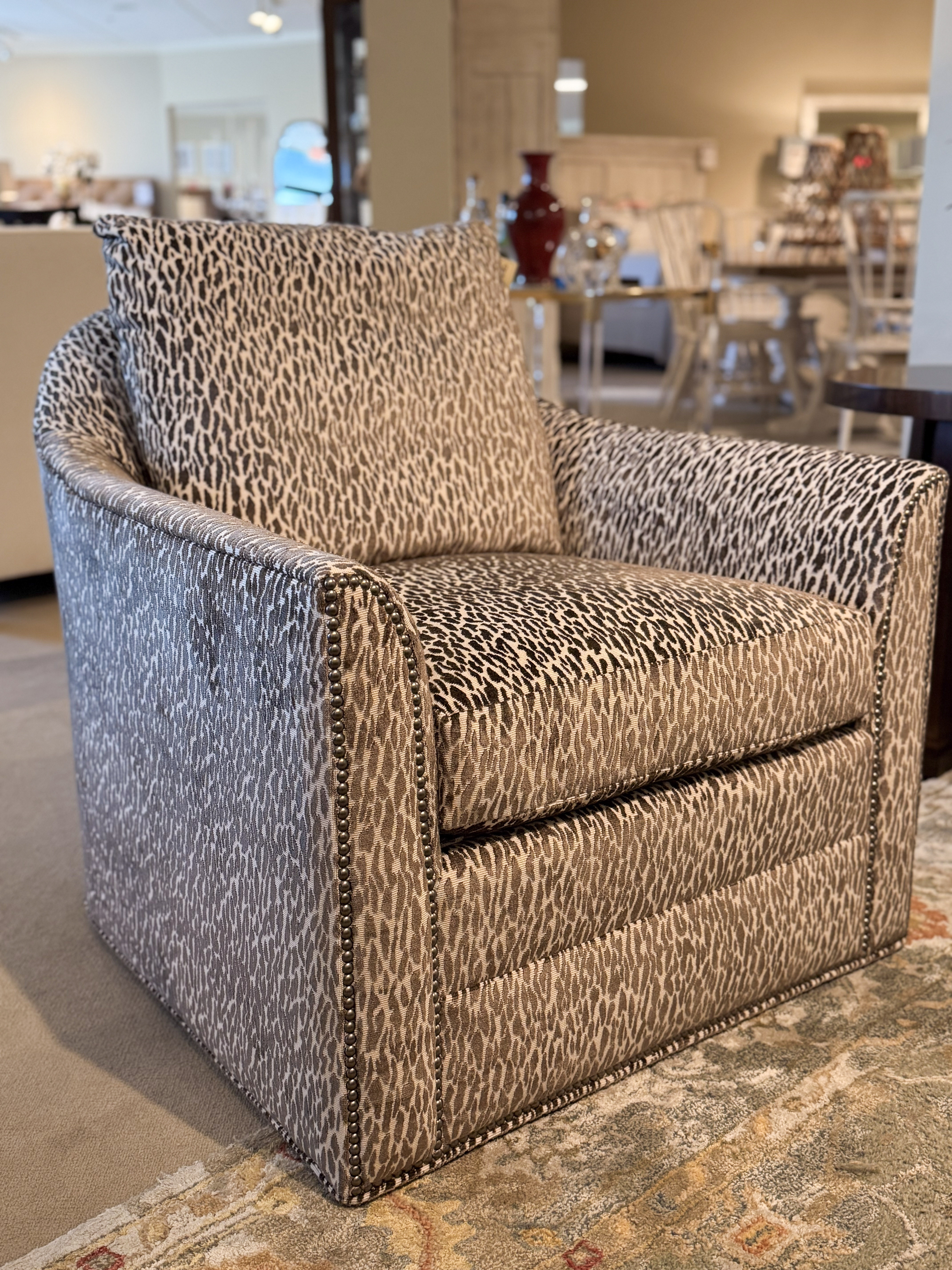 One current favorite in our showrooms is an animal print swivel chair. Its shimmering velvet texture, refined nailhead trim, and smooth swivel bring luxury and practicality together in one inviting seat. It is a statement piece that still feels comfortable for everyday living.