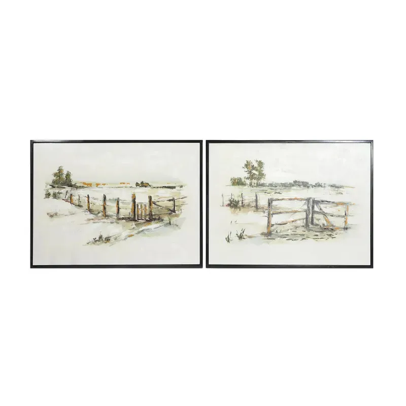 Ideal for cottage-themed interiors or farmhouse-style spaces, the set of two "Fae" wall decor by Crestview Collection complements any atmosphere. Each 40x30" component features a rustic landscape scene, where a weathered barbed-wire fence winds across the foreground, leading the eye towards vast farmland in the distance. Lush trees, their branches swaying gently in the breeze, create a soft backdrop of nature's beauty. Tall grasses ripple in the wind, bringing movement and life to the scene, while the earthy tones and natural textures of the image ground the viewer in a peaceful, rustic setting. The final touch is a simple wood frame that complements the artwork, making this duo the perfect addition to any rustic-inspired space.