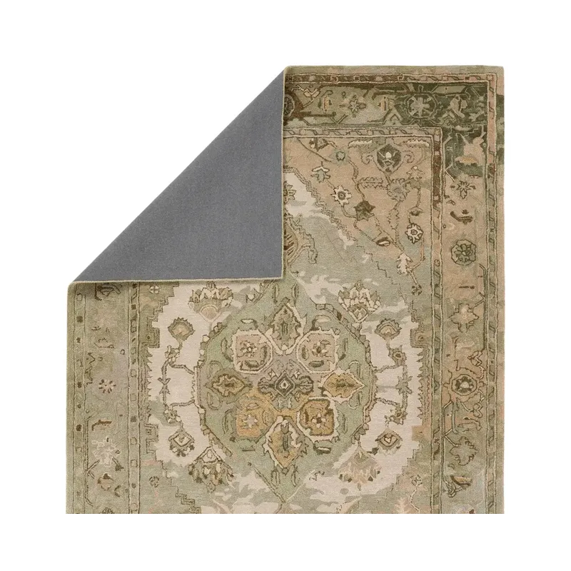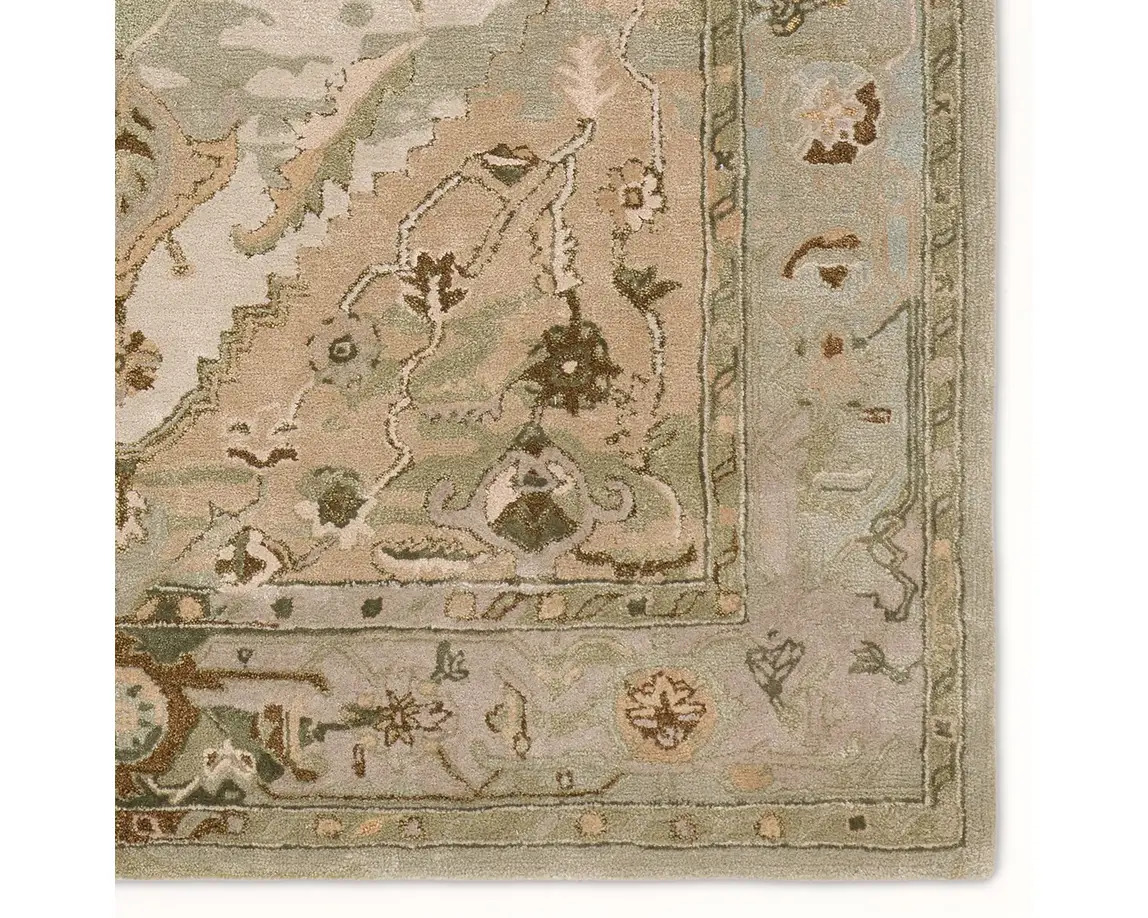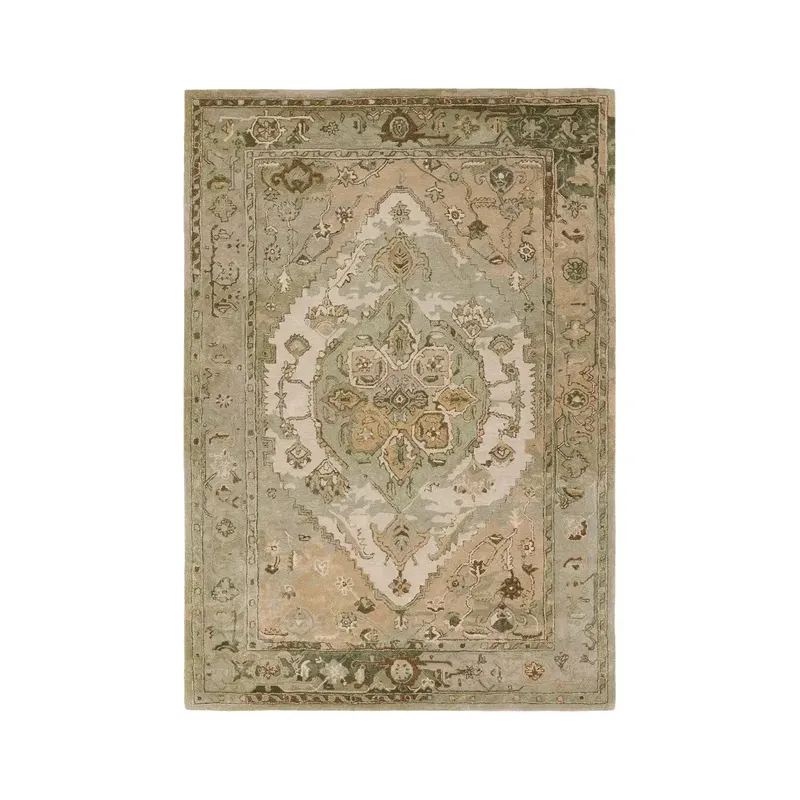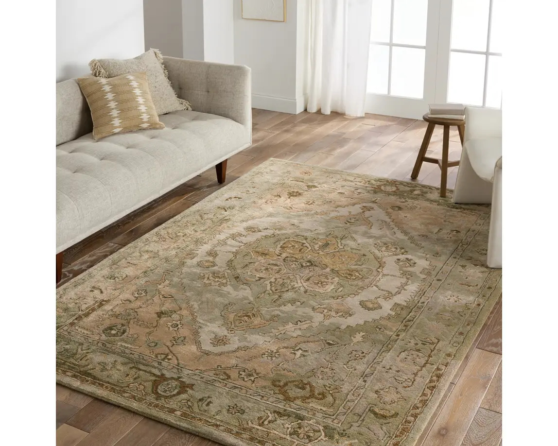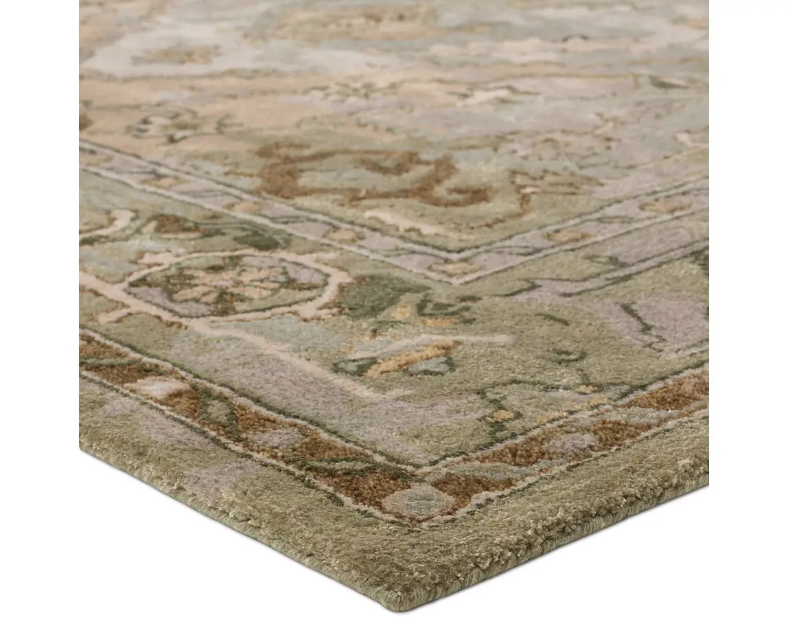 The Citrine collection is an assortment of distressed Old World patterns reinterpreted for modern design. The hand-tufted Raisa rug features an antiqued center medallion in elegant, neutral hues of greens, taupe, beige, and cream. Made of wool and viscose, this timeless rug boasts an ultra-soft feel and elegant sheen. The plush material best suits low traffic spaces of the home, such as bedrooms, formal dining areas, formal living rooms, and sitting rooms.