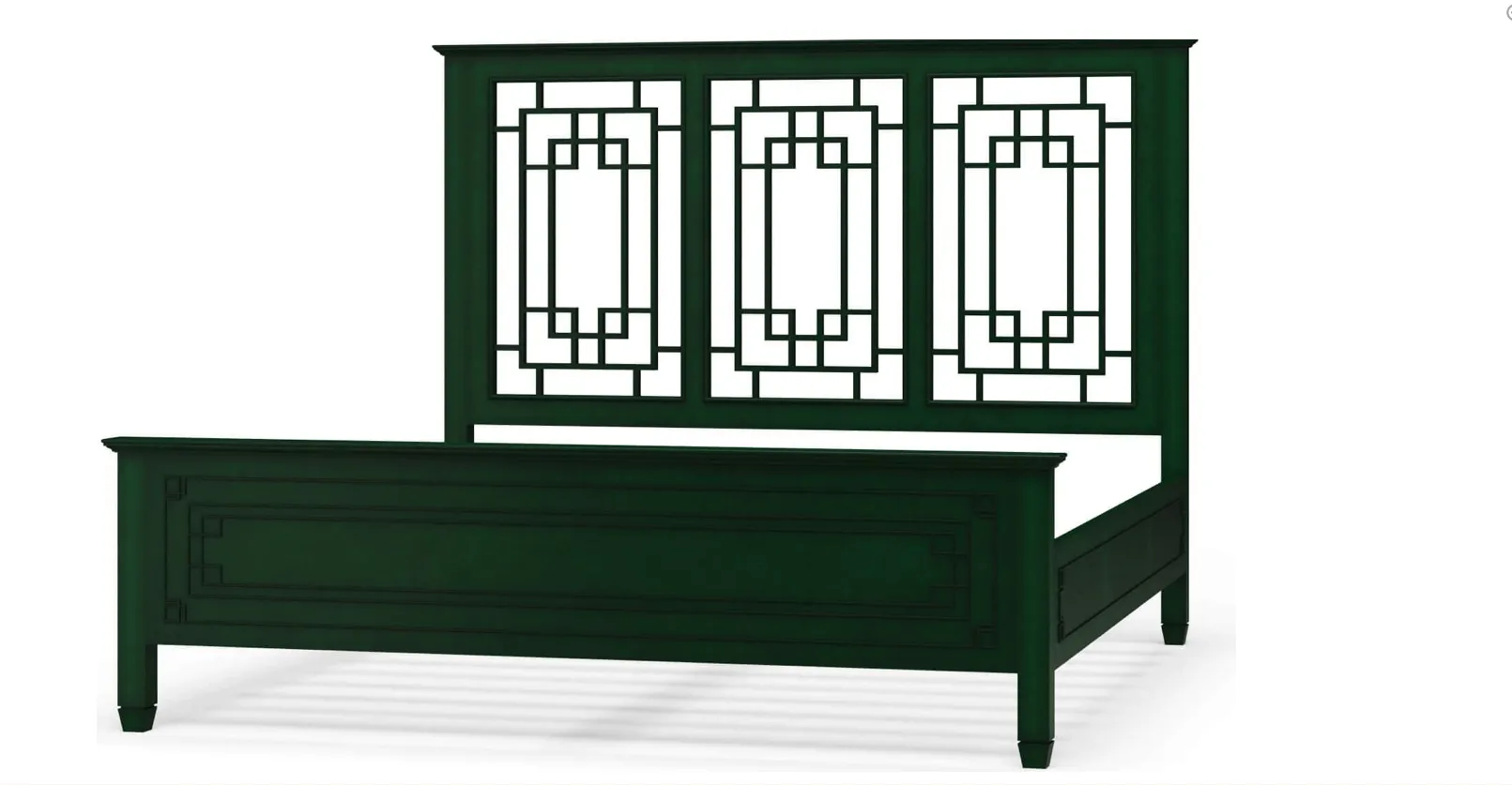 Make a bold statement in your bedroom with this beautifully crafted bed in a rich green finish. The striking geometric headboard design adds depth, dimension, and architectural interest while keeping a timeless, refined feel. Thoughtful craftsmanship is seen in the framed panel footboard, clean lines, and sturdy construction built for lasting durability. This bed blends classic elegance with modern character, creating a centerpiece that feels both luxurious and inviting.