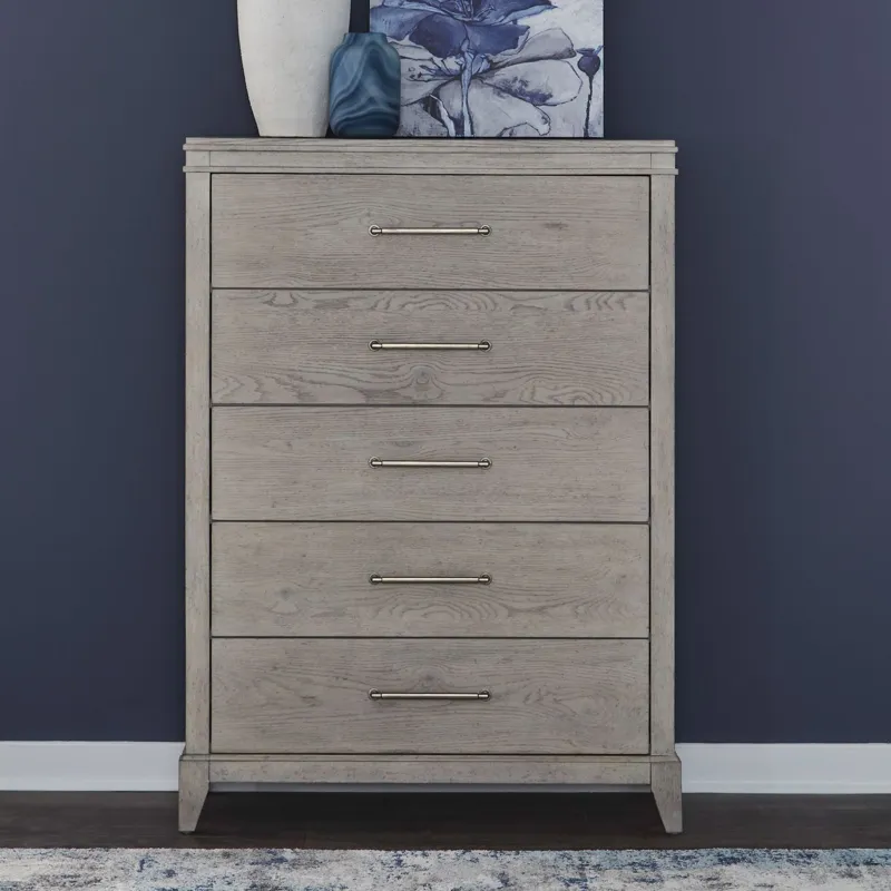 The New Haven 5-drawer chest combines timeless design with practical elegance. Crafted from Rubberwood solids and Small Split Heart White Oak veneers in a Sanctuary White finish, its flat-front drawers are accented with Champagne Silver bar pull hardware. The top drawer features premium felt lining, while the bottom drawer includes a cedar-lined panel. Soft-closing drawer guides add a touch of refinement. Double bead molding on the top apron and graduated step molding on the base apron flow seamlessly into angled tapered feet, completing this sophisticated piece.