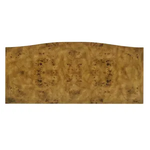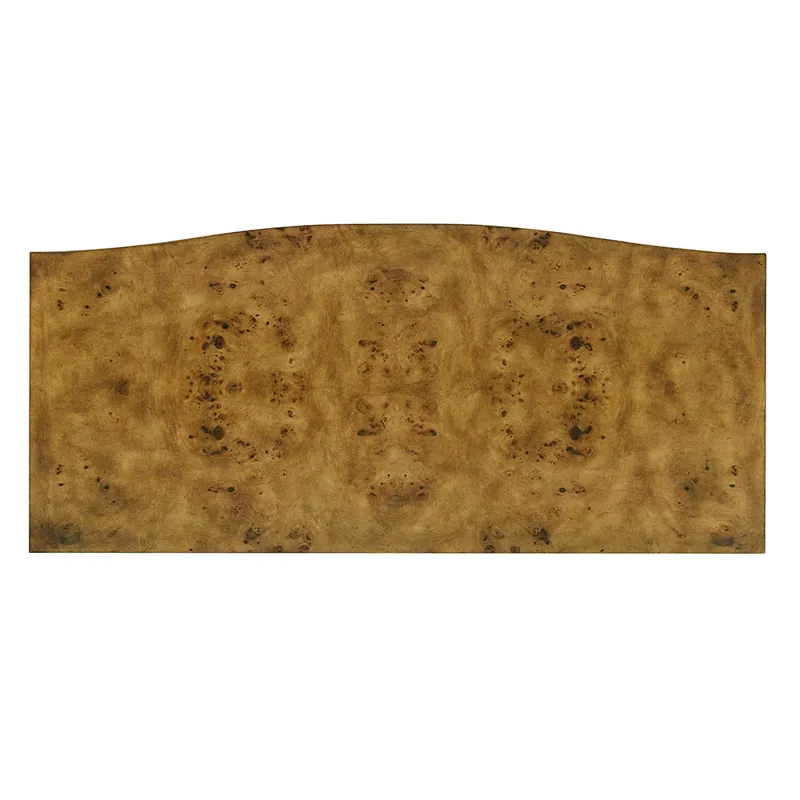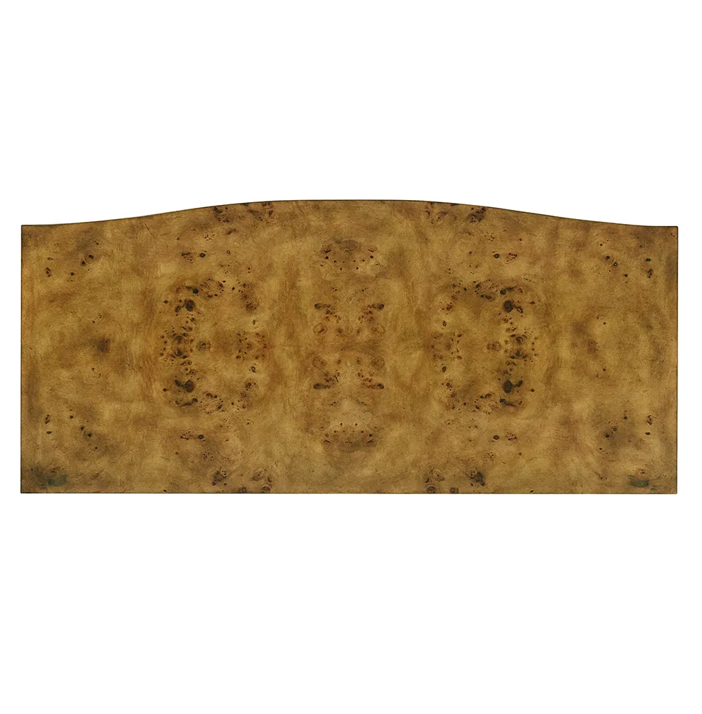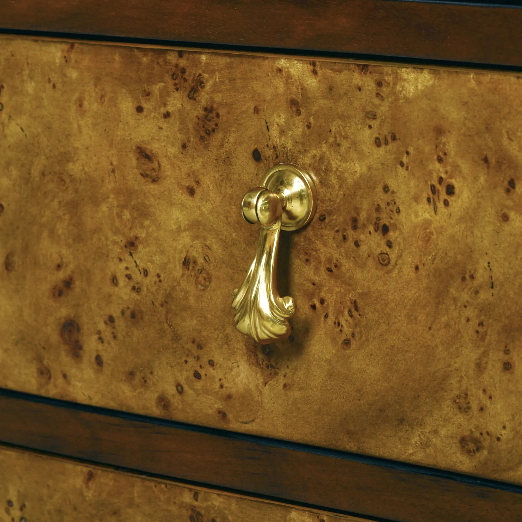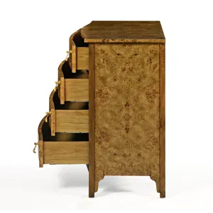 Our Beau Chest features a bow front, four equal size self-closing drawers, and hand-cast polished brass flourish hardware; Rustic finish on Mappa burl veneer.