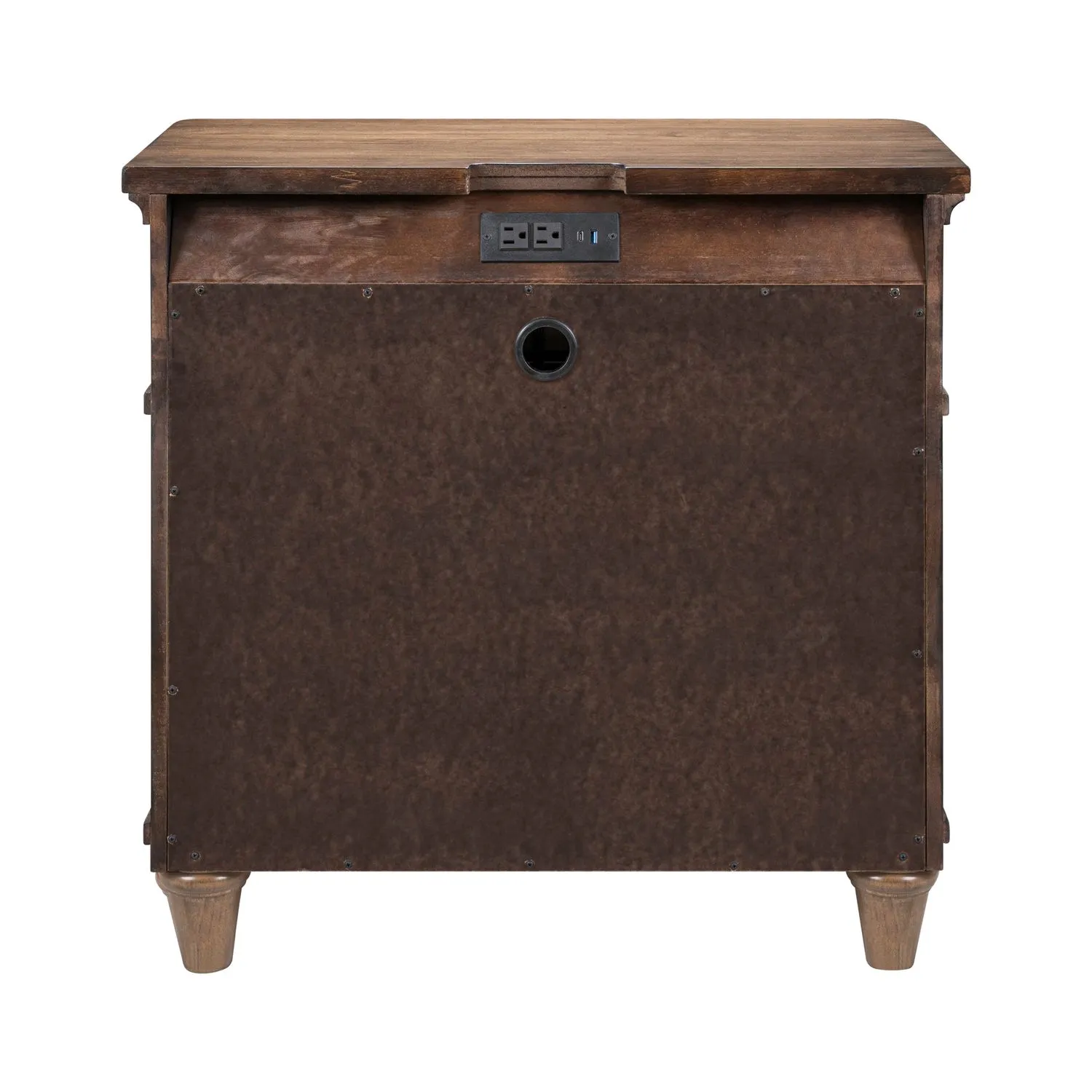The Harrison Heights nightstand with charging station combines classic style with modern convenience. Crafted from Rubberwood solids and Rustic Birch veneers in a rich Sienna finish, this elegant 3-drawer nightstand features softly rounded pilasters flowing into turned feet. Square wood frame molding adds visual contrast to the case. The bluff cut top drawer, lined with premium felt, offers refined storage, while the bottom drawer features a cedar-lined panel for garment preservation. Stay connected with the built-in charging station, equipped with 2 AC outlets, 1 USB-A, and 1 USB-C port for effortless device charging.