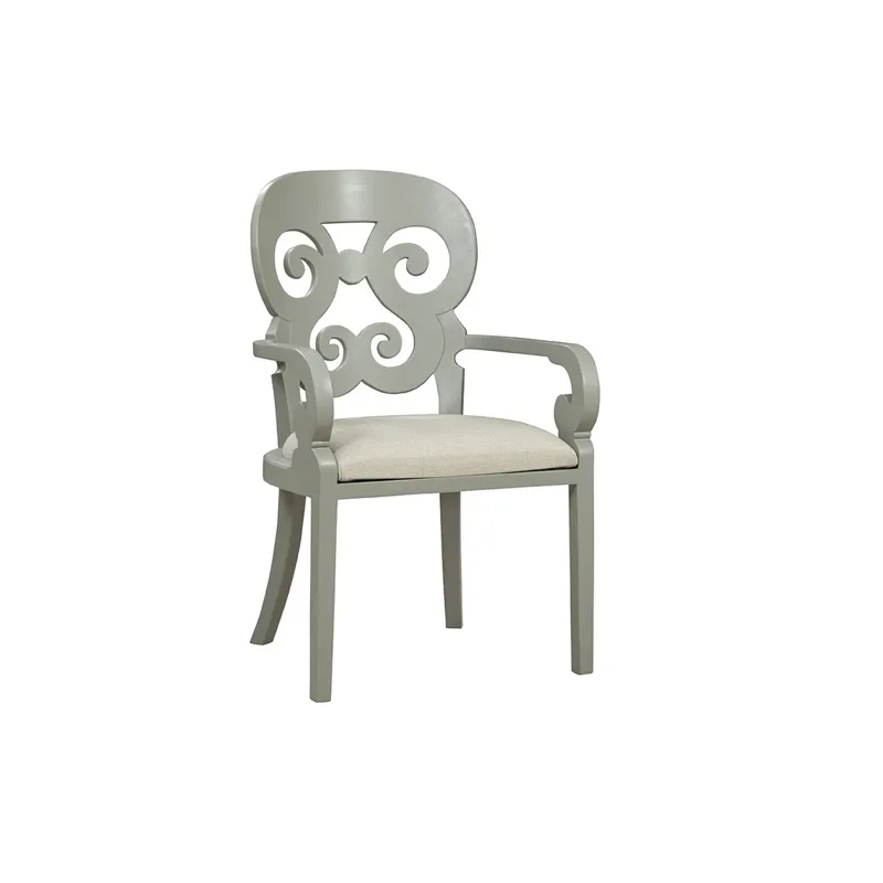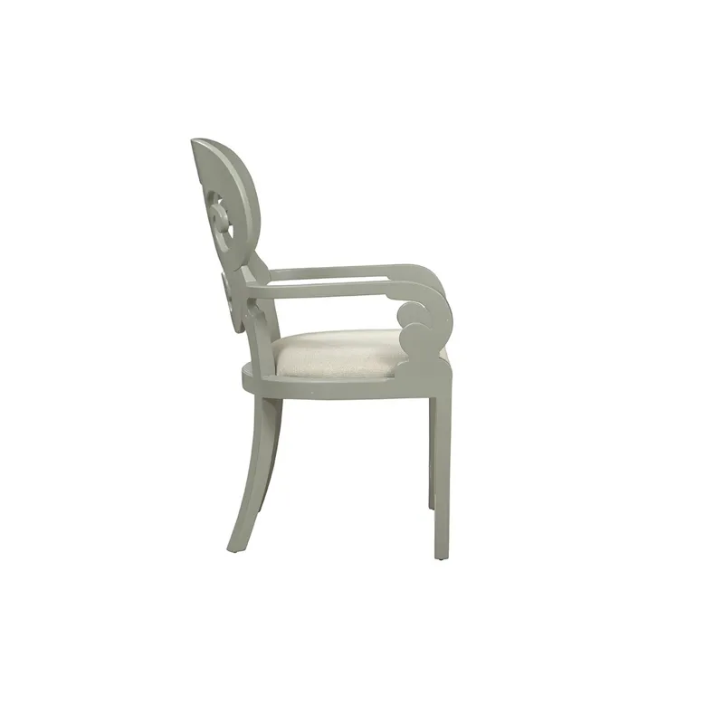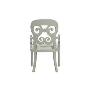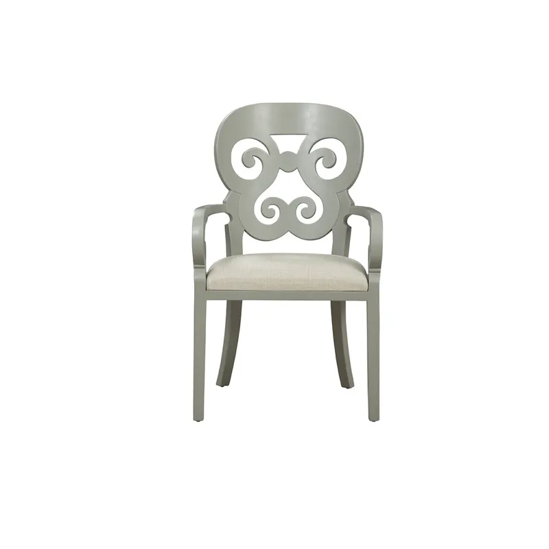 The Gray Bolero Chair blends classical elegance with a modern aesthetic, creating a captivating piece for any space. The unique light grey, almost grey-greenish color adds a more modern touch to your decor. Its smooth, curved design with straight front legs and curved back legs exudes a blend of contemporary and classic styling. The intricate carvings on the back reminiscent of antique chairs add a touch of charm to the overall modern look. With a comfortable linen cushion, this chair is not only stylish but also inviting for relaxation.