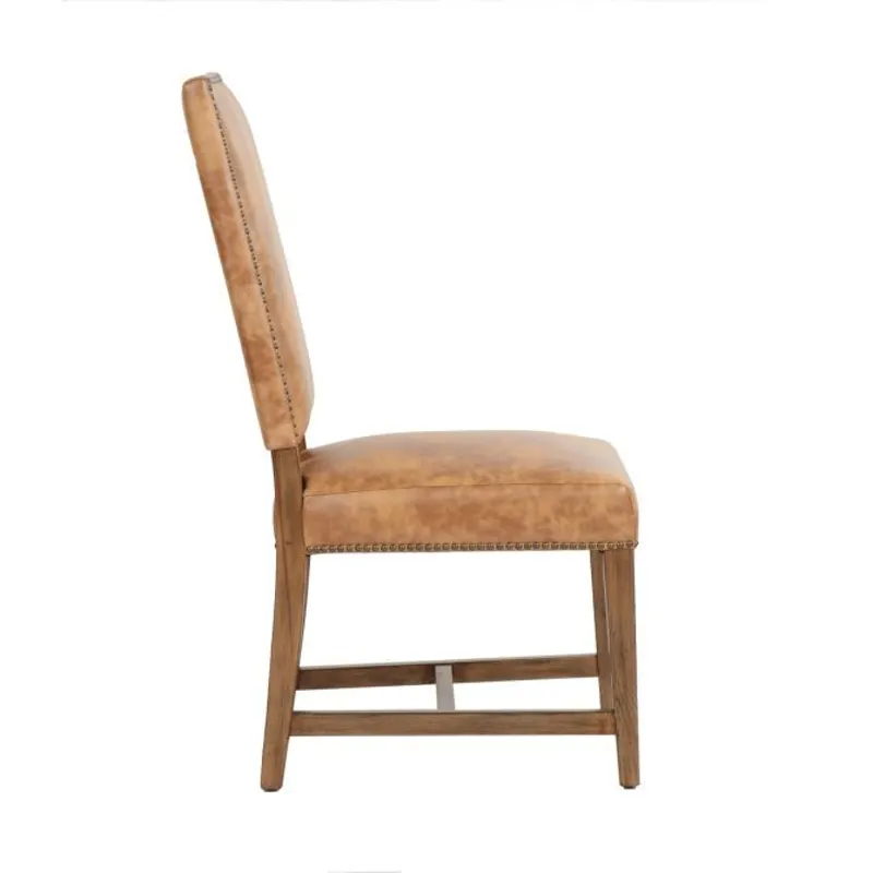 The Darcy Dining Chair is crafted from warm brown top grain pig leather, accented with detailed brass nail heads along the edges. Its earth-toned legs add a grounding touch, making this chair a perfect blend of elegance and durability for any dining space.