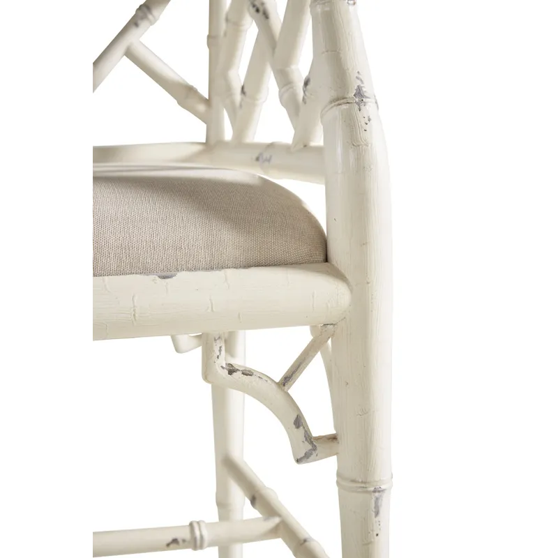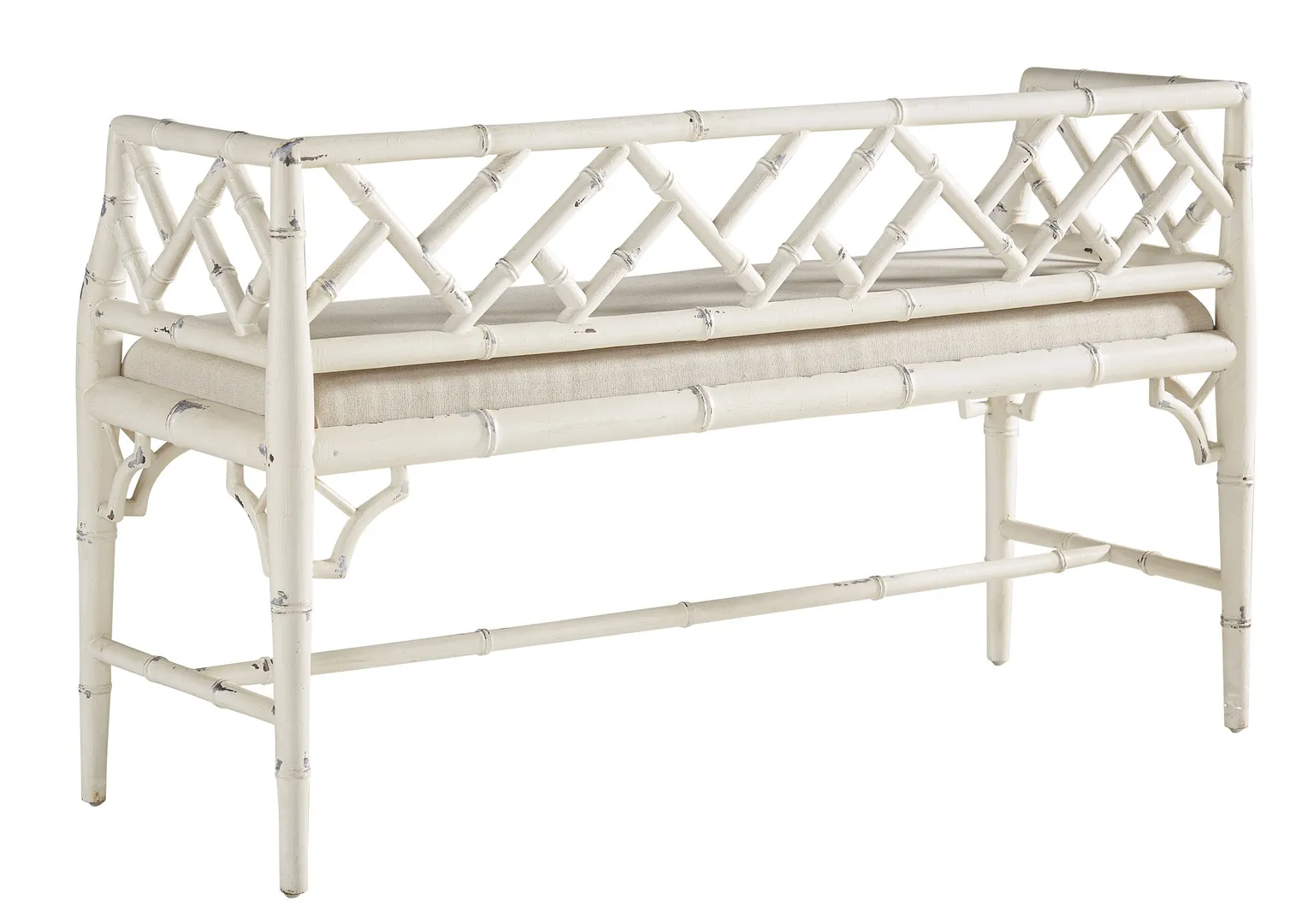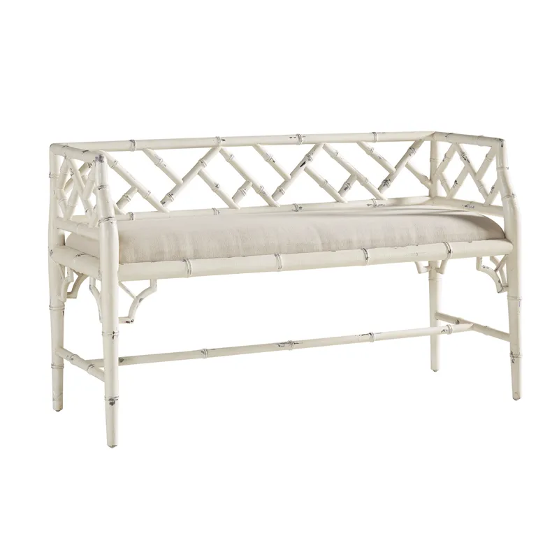 Perfectly scaled to rest at the foot of your bed or in an entry way, this charming beauty is sturdy enough for two! The solid mahogany is turned to replicate bamboo, and then painted a softly distressed white. The drop seat is upholstered in a neutral linen, but is easily reupholstered to enhance your decor.