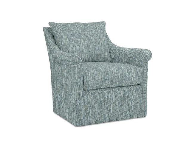 Understated and elegant, this swivel chair is beauty defined. It features slender sloping arms that taper from back to front and is finished with a pleated detail on the face. French seamed overall with a knife-edge bed-pillow style back pillow. Blend Down seat cushion.