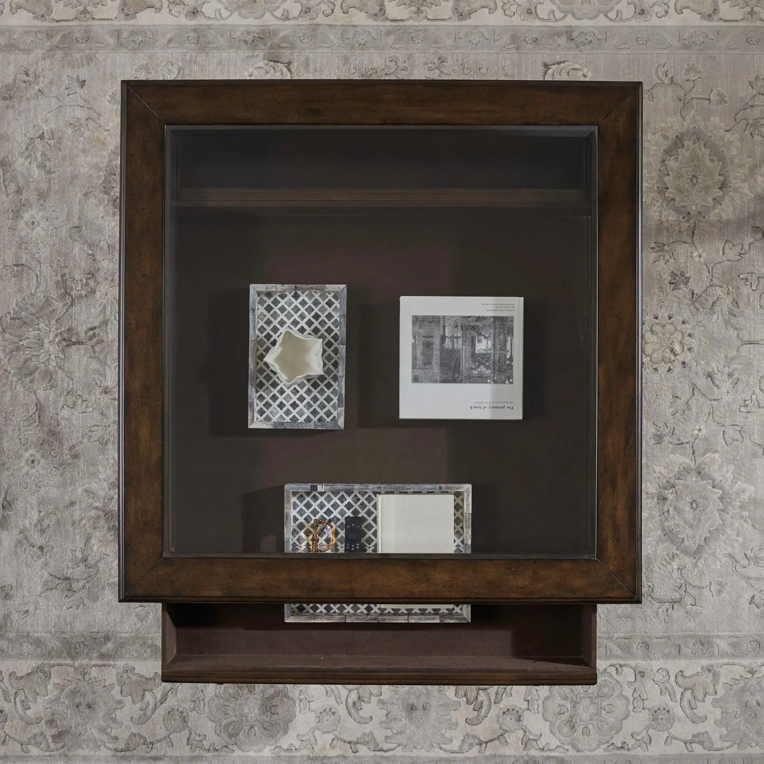 Give your home a personal touch that reflects your passions and personality with the Arden Road square collector cocktail table. This cocktail table is a nostalgic blend of vintage charm and modern functionality that elevates your living space with timeless appeal. Meticulously crafted using Poplar solids and Rustic Alder veneers, this piece features a Satin Cherry finish. The wood framed glass top invites you to showcase your cherished collectibles, adding a touch of sophistication to your living room. The felt-lined top drawer, revealed through the glass, offers a glimpse into the past, allowing you to curate and display your treasures with pride. The Antique Brass knob hardware of the drawers complements the wood framing, adding a touch of elegance that resonates with classic aesthetics. The large bottom drawer, with a bluff cut drawer front, captures the essence of multiple smaller drawers while providing deep storage. This clever design marries the appearance of a vintage collector’s piece with the practicality of ample storage space, offering both form and function in one beautifully crafted table. The wood framed drawer fronts create a cohesive and charming look that harks back to an era of timeless craftsmanship. The other end of the cocktail table mimics the drawer function, maintaining a balanced and symmetrical aesthetic that resonates with collector’s sensibilities. Adding to its vintage charm, the side panels are adorned with bead molding, a subtle detail that enhances the overall character of the table. The casters provide easy mobility, ensuring that this collector’s cocktail table adapts to your dynamic lifestyle, whether you’re rearranging your space or entertaining guests. The Arden Road square collector cocktail table is more than just furniture; it’s a journey through time, an invitation to showcase your passion for collecting, and a testament to the enduring allure of classic design.