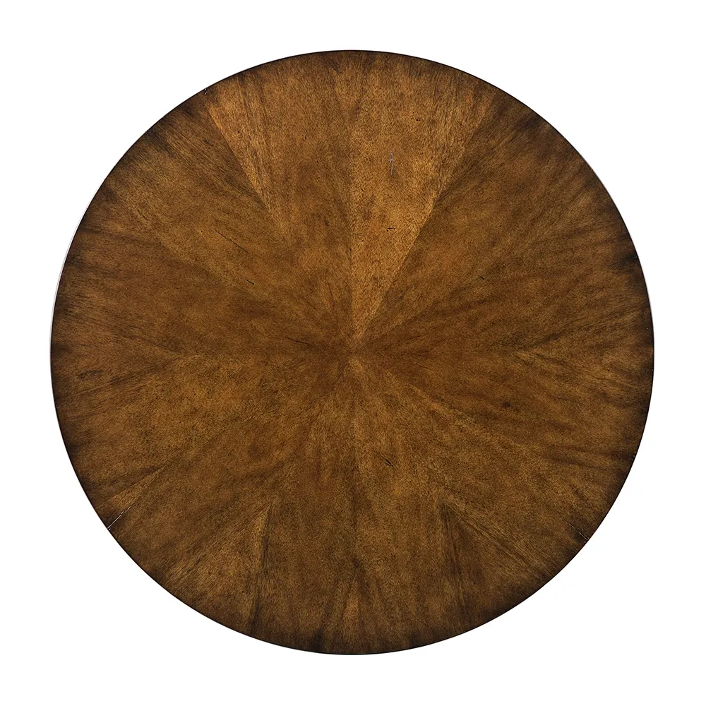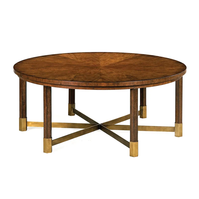 Our Clovis Coffee Table features a radial veneer pattern top, a smooth straight top edge, 6 six sided straight legs, and metal ferrules and a radial stretcher; Country finish on Acacia crown veneer and solids.