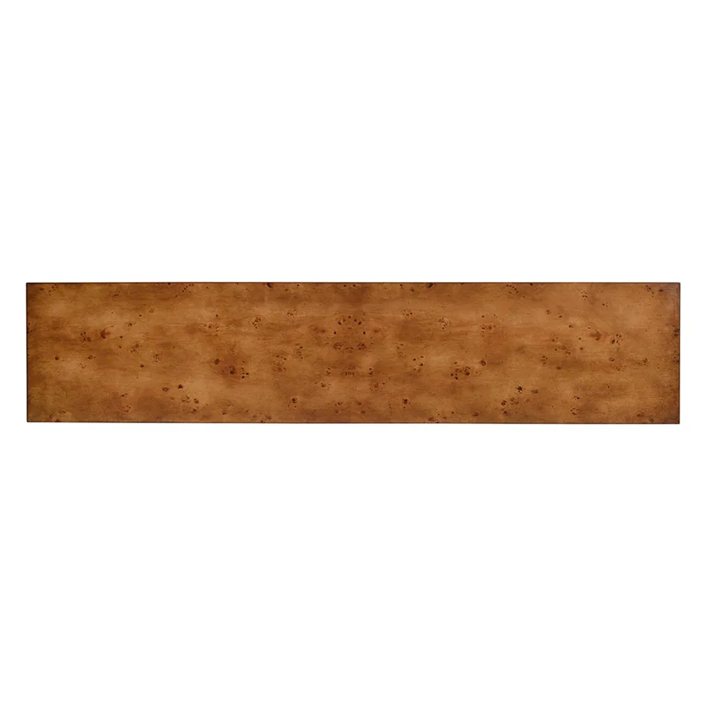 Our Ashton Console Table features beveled detail on both legs and the underside; Rustic finish on Mappa burl veneer.