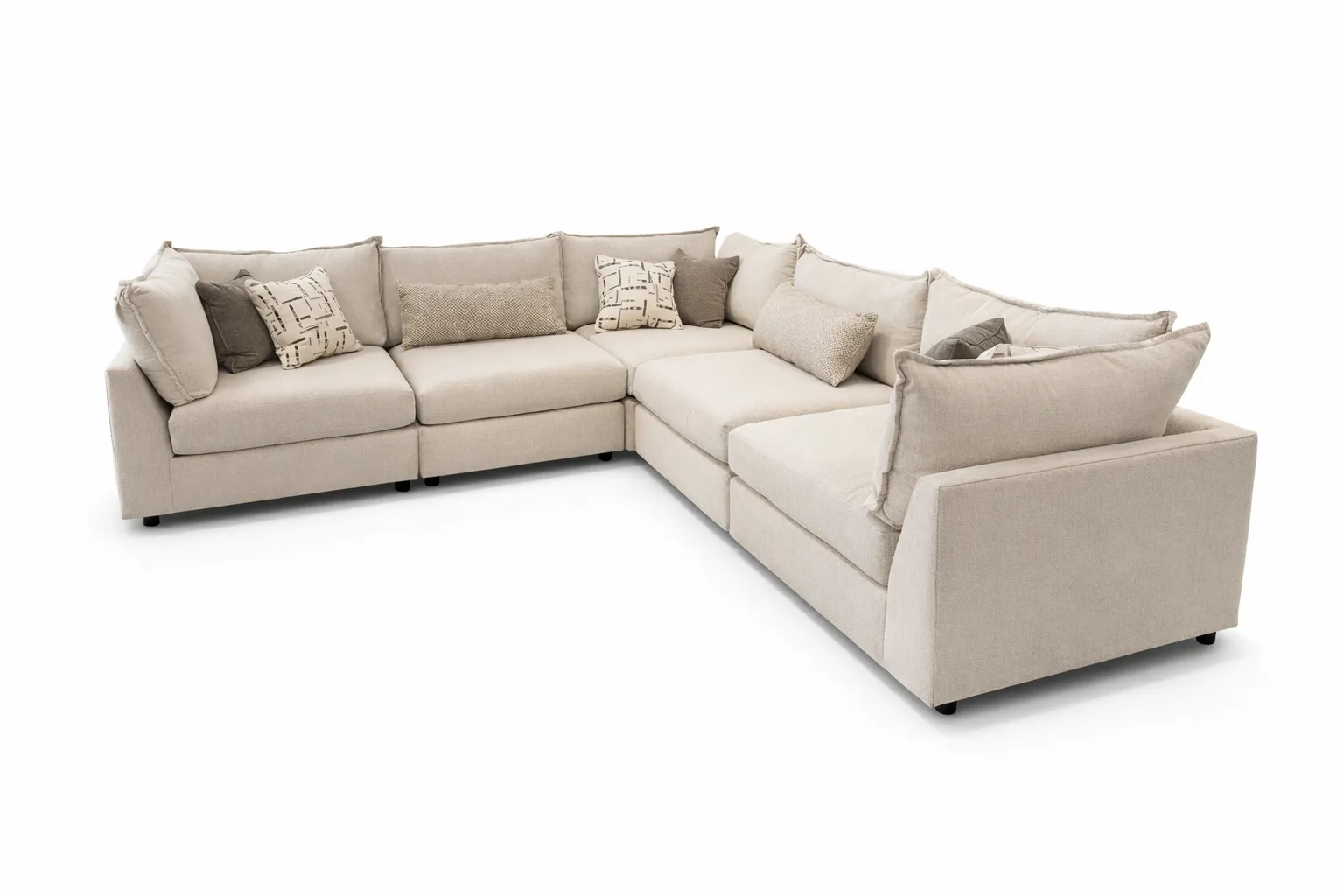 This modular sectional is designed for flexible living and easy rearranging. Built with two armless pieces and three corner pieces, it creates a spacious, wraparound seating arrangement that can adapt to your room and lifestyle. The clean lines and neutral upholstery make it easy to coordinate with a variety of styles, while the deep cushions offer comfortable, everyday seating for family and guests. Perfect for larger spaces or open-concept rooms, this sectional delivers both versatility and comfort in one smart design.