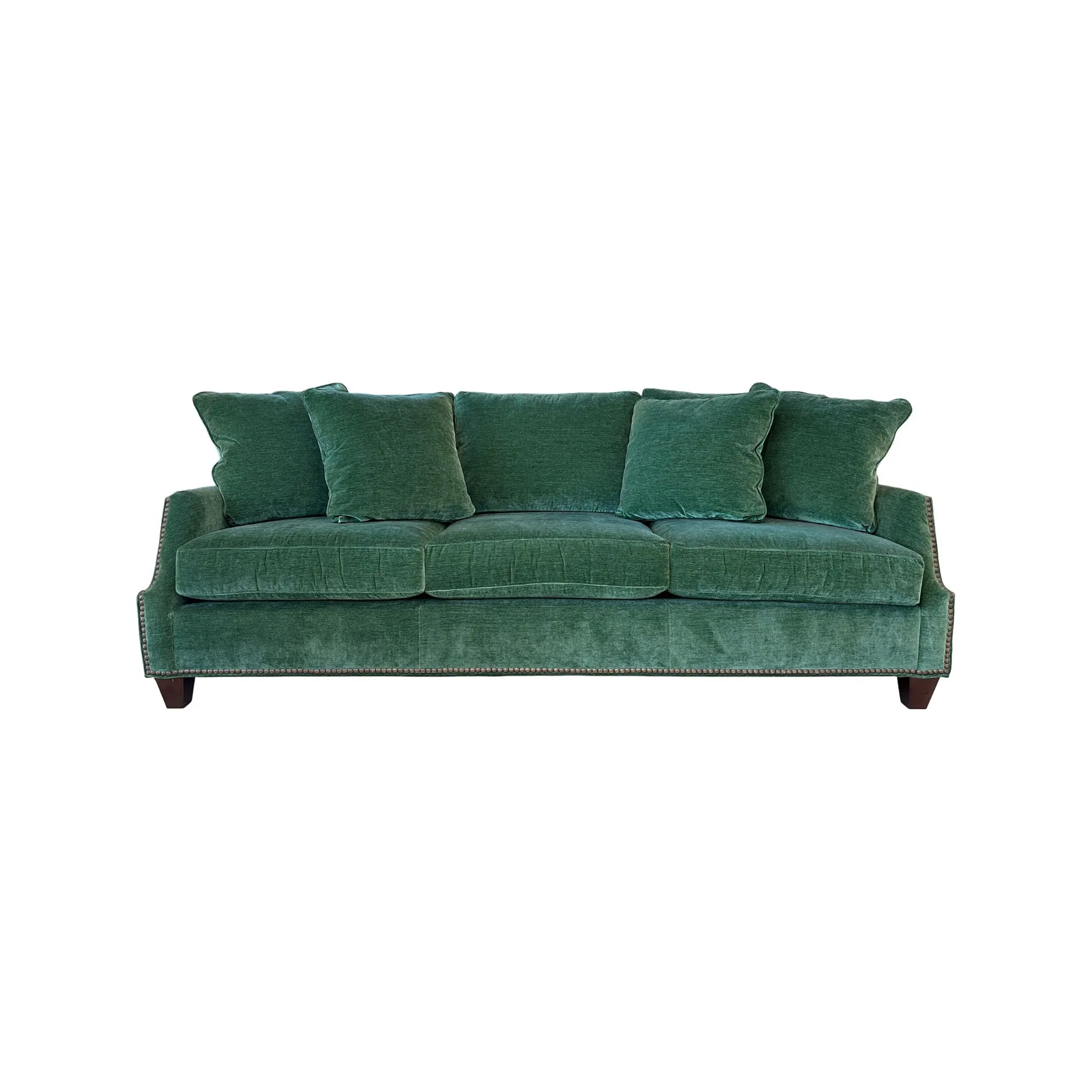 Transitional styling allows this sofa to feel at home in both traditional or modern settings. Nail head trim frames the top and bottom rails and accents the dramatic shape of the arms. Tapered legs further enhance the clean look. With loose back pillows and plush seat cushions, you won't believe the comfort! 2 pairs of accent pillows. Optional nail finishes available. Also available are the matching loveseat, chair, and ottoman. Also available with Blend Down seating and toss pillows using style number 790350BD.