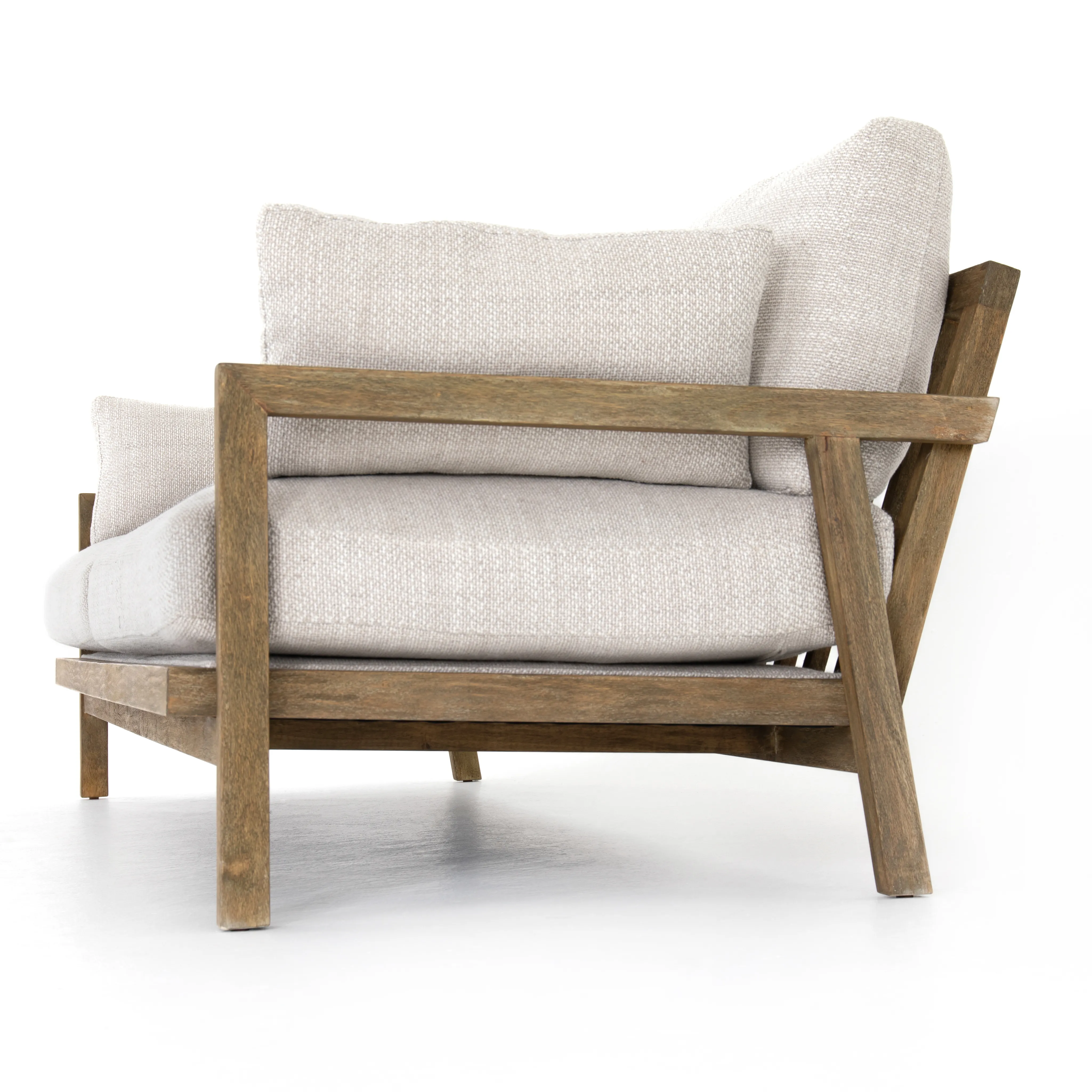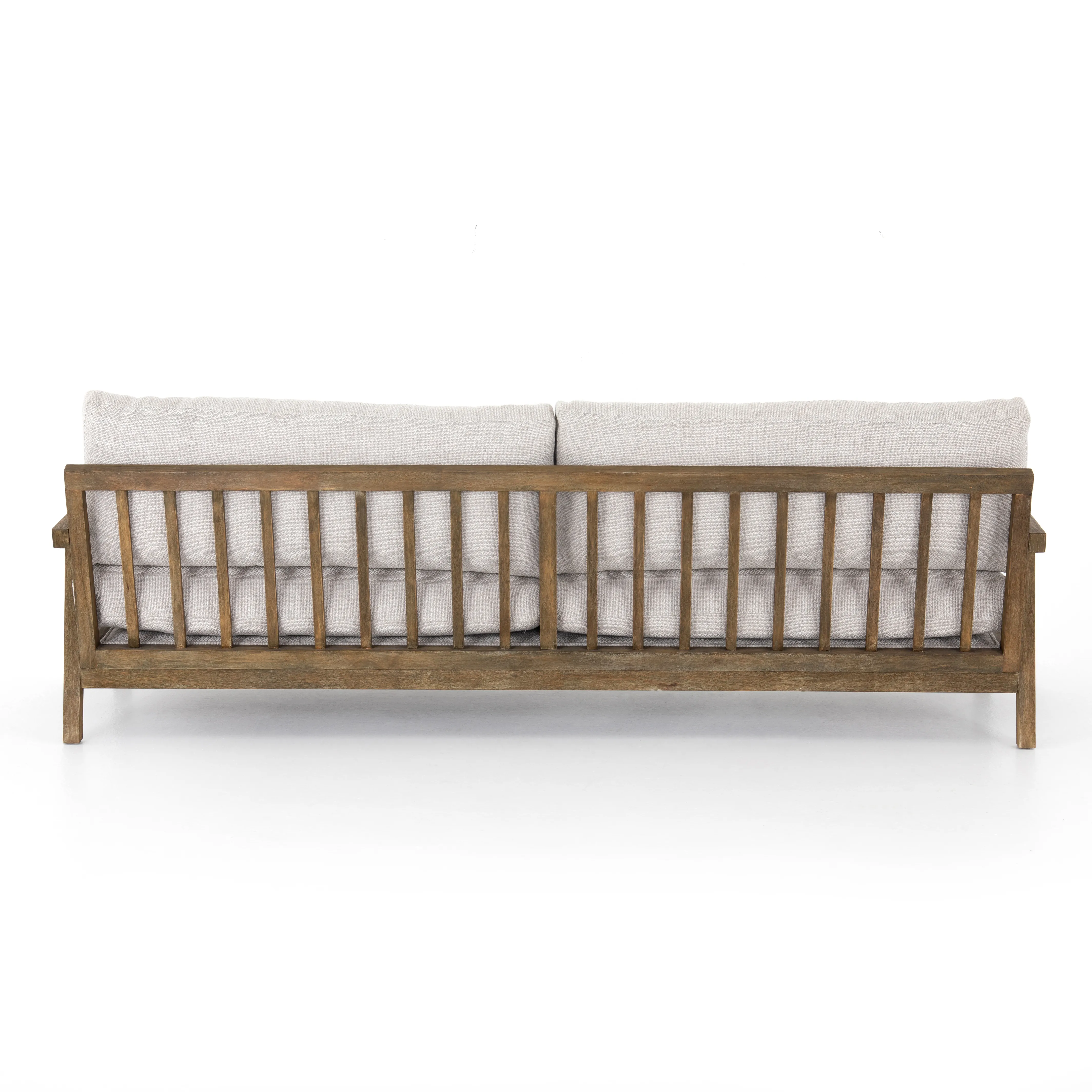 Sit down. Stay a while. Textural wheat-colored upholstery and feather-blend cushions framed by shale grey-finished rubberwood framing with spindle back detailing.