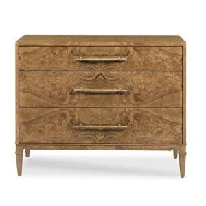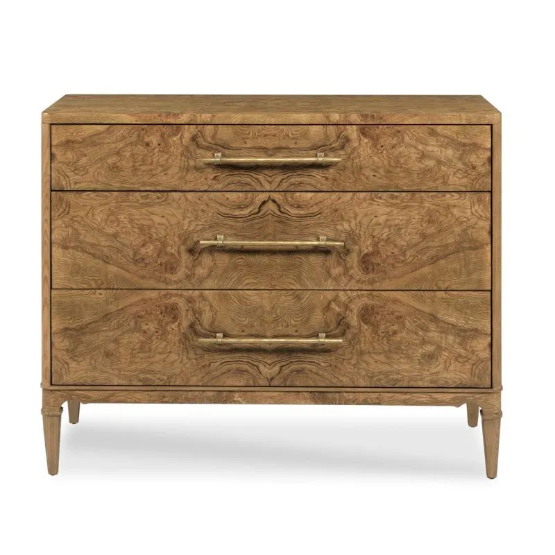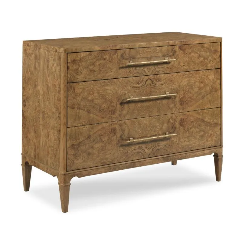 A stylish chest with a rectangular top over three storage drawers elevated on tapering legs.